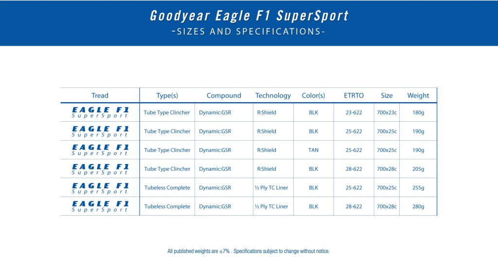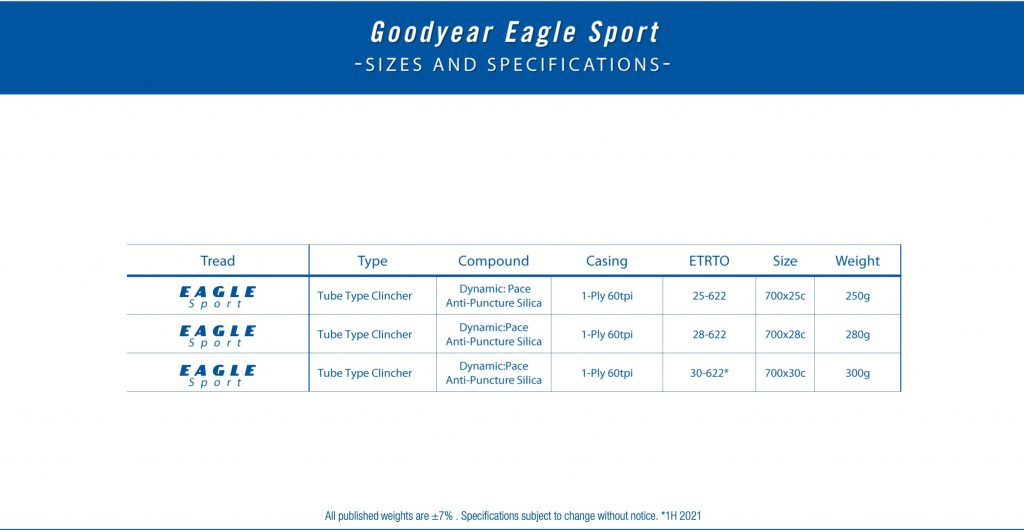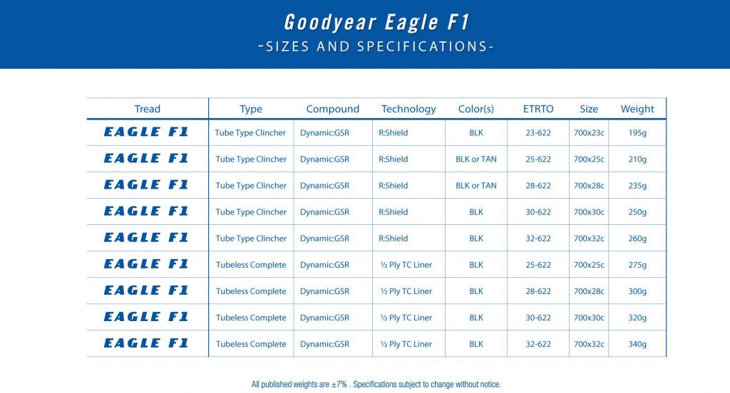 Ce pneu n’existe qu’en version chambre à air, il dispose d’une carcasse Nylon 60 TPI et d’un mélange de gomme Dynamic:Pace qui le rend plus résistant à la crevaison de 8,7 % par rapport au Dynamic:GSR. Il pèse 250 g en 25 mm. Et conserve un niveau de performances qui permettra de rouler sportivement. Mais avec des performances moindres que celles de l’Eagle F1 bien entendu !