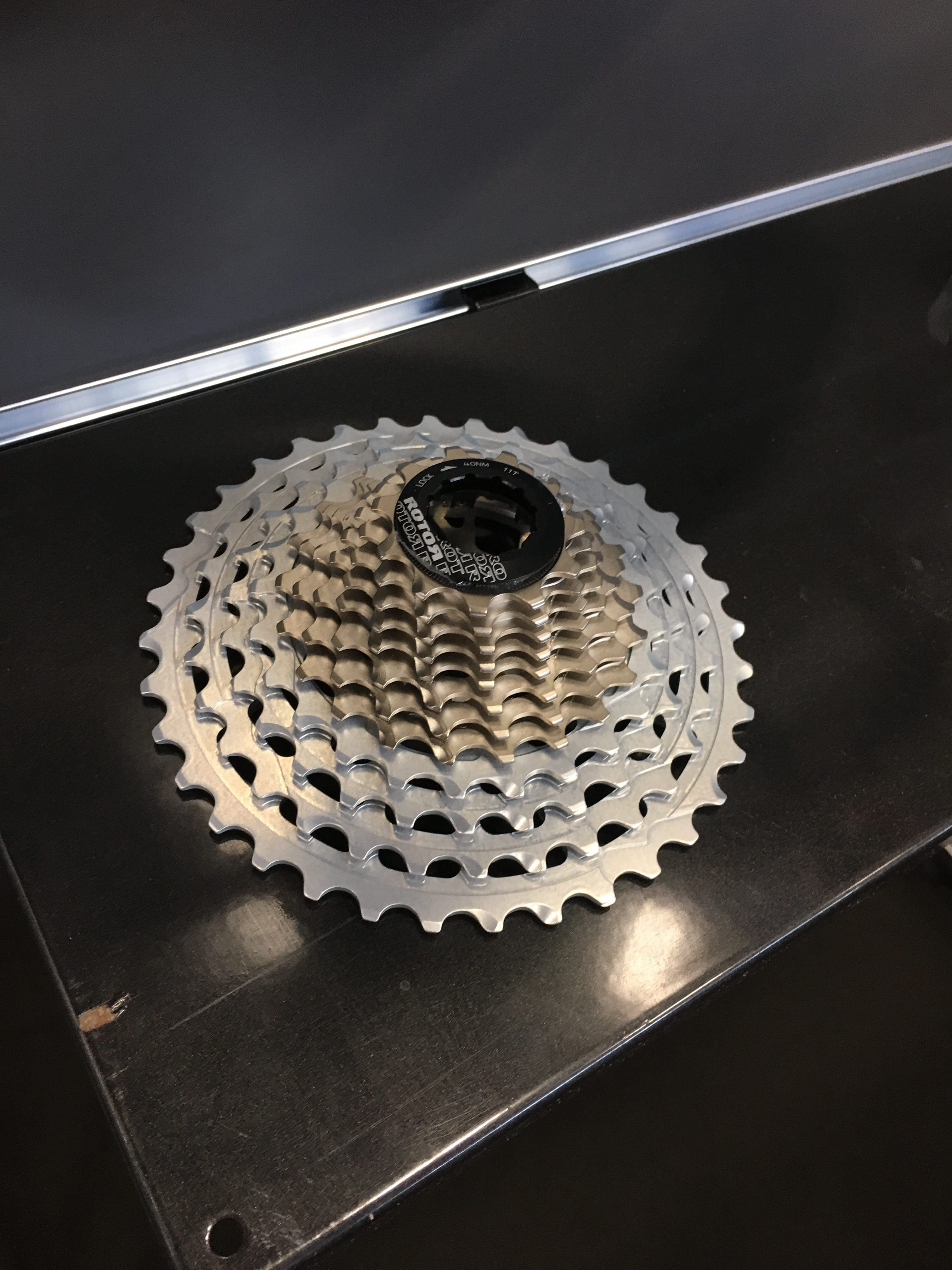 Ici la notion de groupe s’élargit puisqu’elle intègre également les roues, cassette 13 vitesses oblige ! Dans le montant demandé il y a donc une paire de roues avec jantes aluminium ou carbone suivant les versions. Elles sont compatibles Tubeless. Mais ce groupe peut également fonctionner en 12 vitesses moyennant un petit réglage, plus aisé à faire avant de sortir qu’en cas de dépannage au bord de la route. Il est donc aussi disponible à la vente dans « cette version » à 2 000 € mais sans roues et avec une cassette 12 vitesses qui se monte sur les corps HG. Le « groupe » comporte toujours les étriers à disque, les leviers, le dérailleur arrière, la cassette, la chaîne – compatible 12 et 13 vitesses – et un pédalier. Suivant les versions de groupes, on a un pédalier Aldhu ou un 2InPower (avec capteur de puissance). Toujours en mono-plateau, et là on voit large puisqu’on va du 38 au 54 dents en rond ou en ovale. Des dentures sportives car les cassettes 13 vitesses commencent avec 10 dents… Il faut donc des cuisses à partir du 50 dents ! Maintenant les cassettes permettent de grimper aux arbres car on a 10-36, 10-39, 10-46 et 10-52. De gros écarts en perspective malgré les 13 pignons mais de quoi voir venir car on est largement en dessus du tour de roue (2,1 m). La chaîne est compatible 12 et 13 vitesses. En termes de poids, il est difficile de se prononcer pour l’instant dans la mesure où Rotor intègre celui de sa paire de roues – incontournable- dans le calcul !