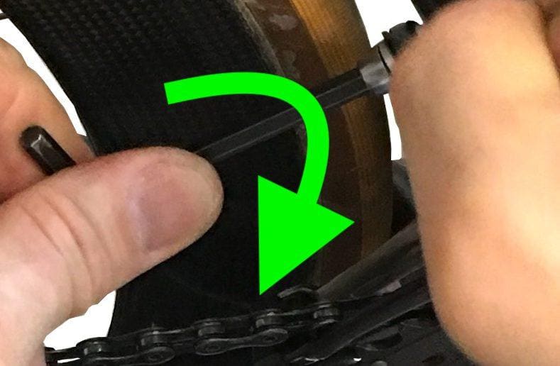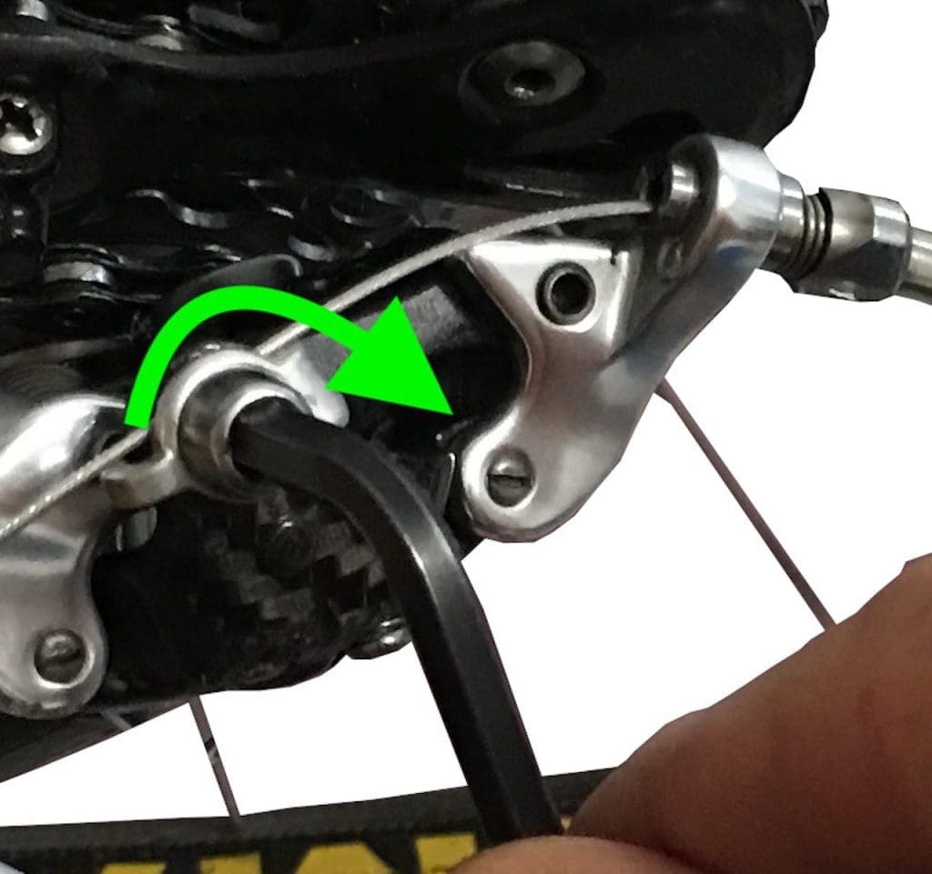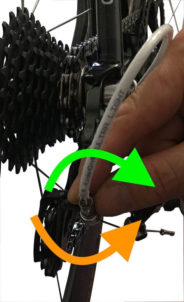On va agir sur le barillet en le serrant pour détendre le câble (flèche verte) ou en le desserrant (flèche orange) pour le tendre. Dans tous les cas on y va quart de tour par quart de tour. L’astuce pour se souvenir du sens est la suivante. Il faut tourner le barillet dans le sens où l’on veut que la chaîne aille !