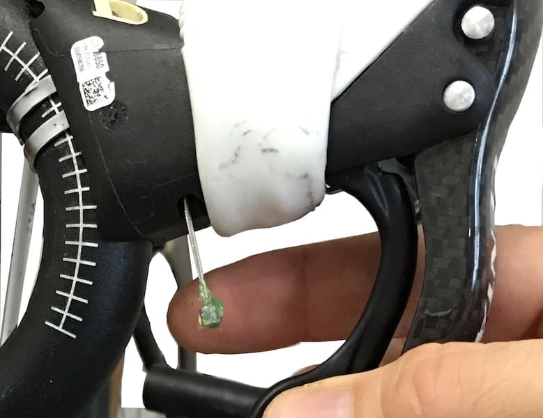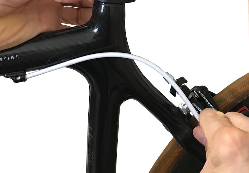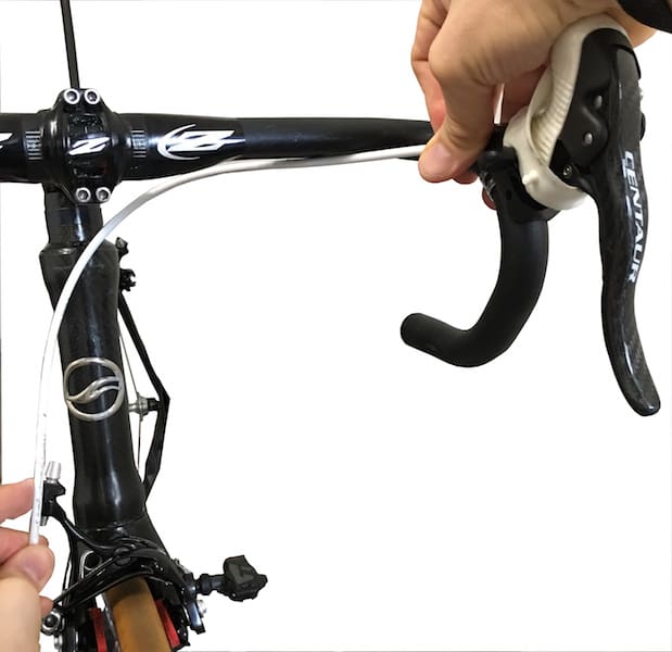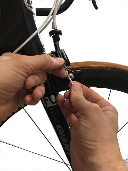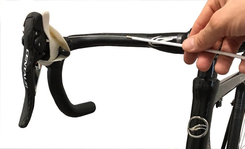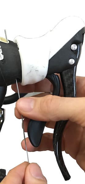On passe le câble de frein dans le levier Ergopower.