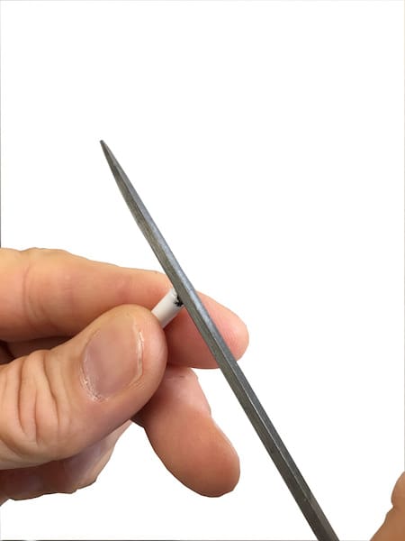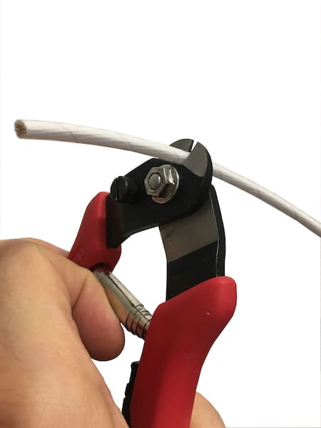 A l’aide de la pince coupe-câble, on « mord » l’embout de câble en 2 ou 3 endroits. On y va calmement car il se tranche facilement.