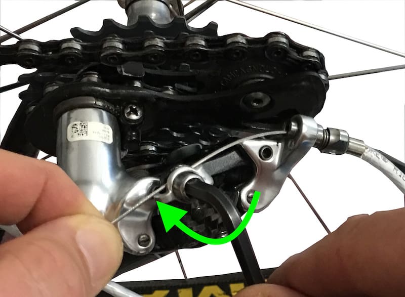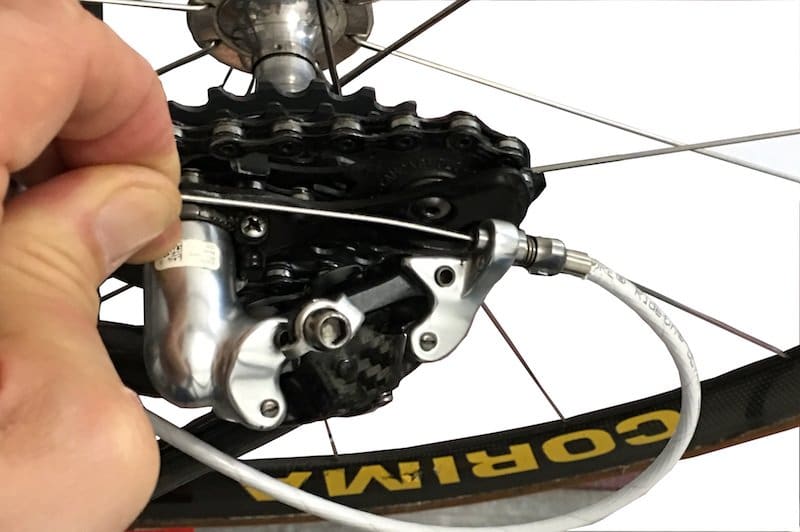 On fixe alors le câble comme ceci pour un dérailleur Campagnolo.