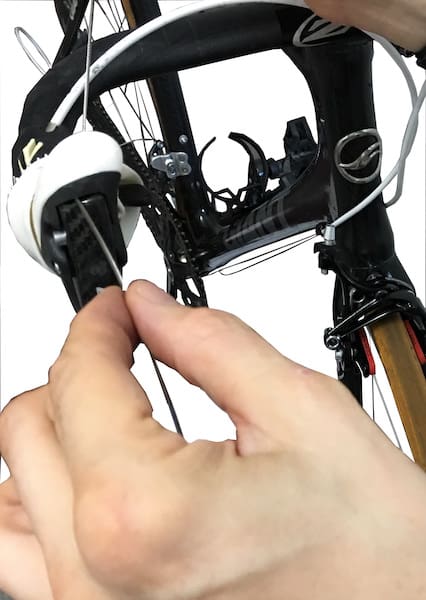On rentre les câbles de dérailleur dans le levier. On aura descendu toutes les vitesses et le plateau avant de se lancer…
