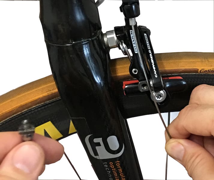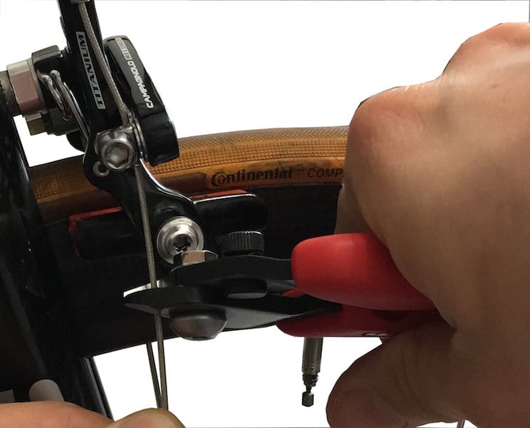 On serre le câble en maintenant les patins. Il faudra le retendre après plusieurs freinages de test.