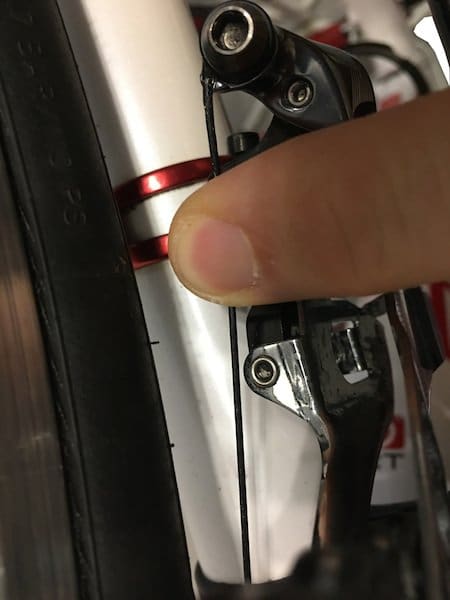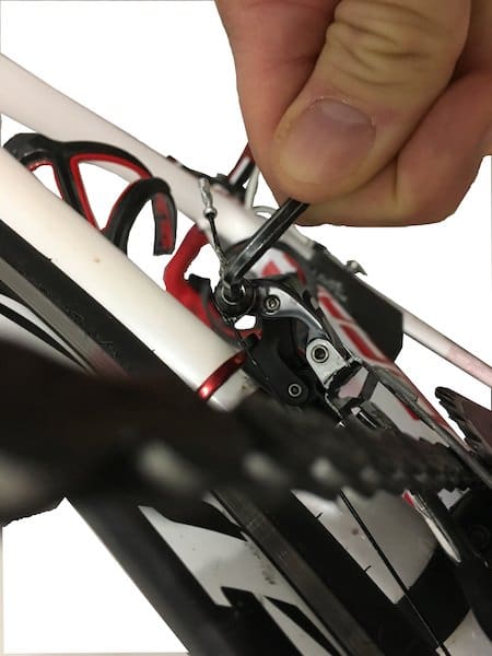 On regarde comment est le mou sur le câble de dérailleur avant. Si c’est un passage interne on le teste ici.