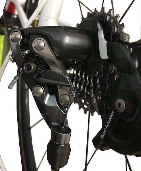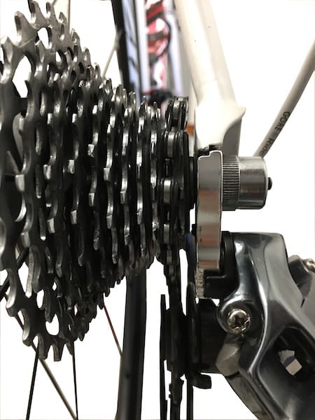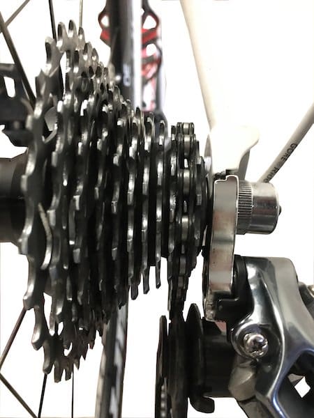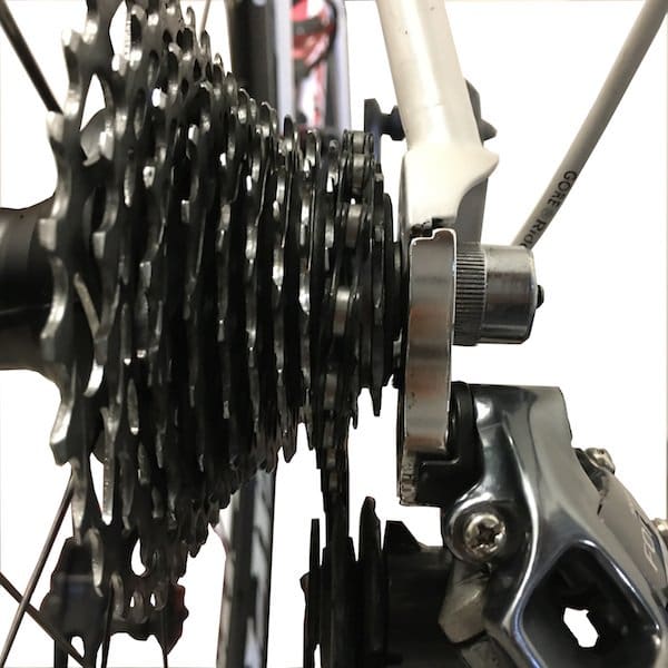 Une fois que « le silence » est atteint, on va rappuyer sur le levier pour redescendre sur le plus petit pignon. Et on va remonter ensuite toutes les vitesses, une à une en restant sur chacune quelques secondes pour s’assurer que tout est silencieux, sans bruit de frottement. Nous avons pris le parti de régler l’indexation à partir du plus petit pignon car cela permet d’évacuer le problème d’un câble trop ou pas assez tendu qui donnerait un pignon fantôme.