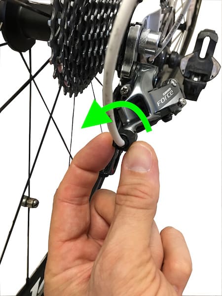… On tourne le barillet de tension dans ce sens, quart de tour par quart de tour, en continuant de pédaler et jusqu’au passage du pignon.