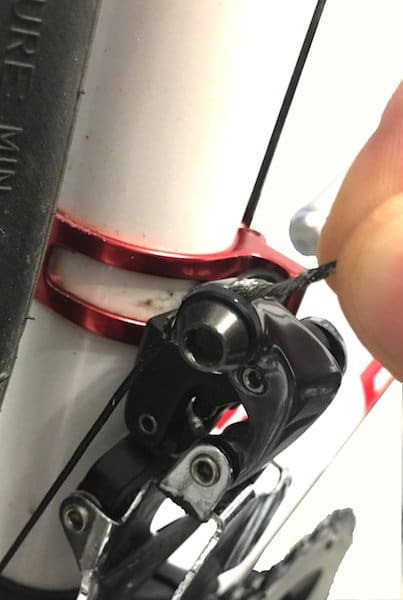 On va s’assurer que le câble passe bien comme il faut dans le dérailleur. Le chemin « Sram » étant moins direct que celui de la concurrence.
