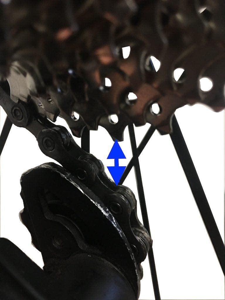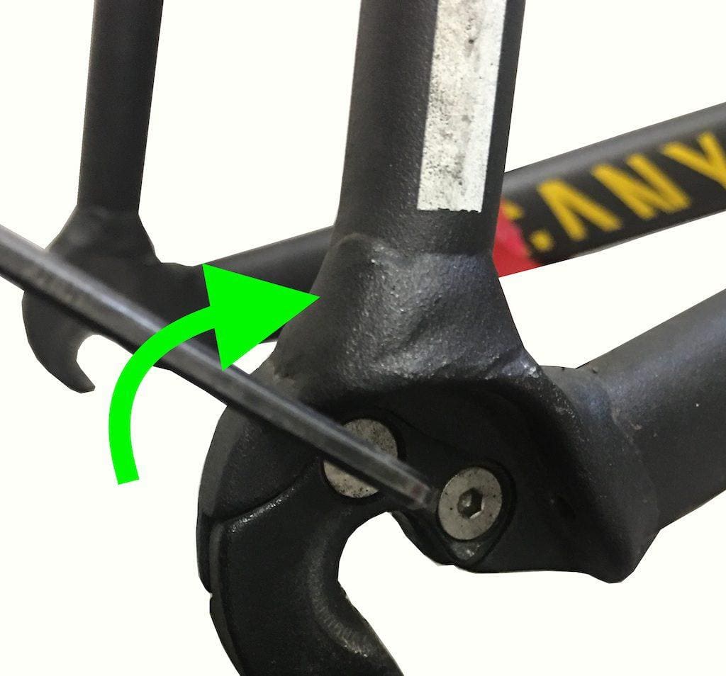 On place une clé allen de 5 mm comme ceci le long des dents du plateau et on regarde l’écart avec la fourchette.