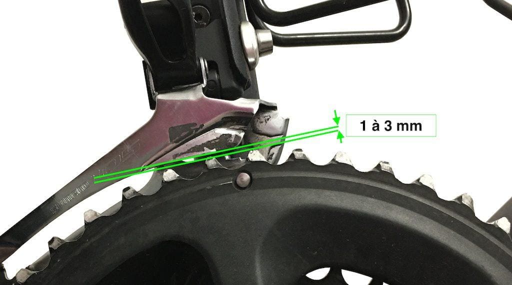 On commence par positionner le dérailleur en hauteur. La fourchette doit passer entre 1 et 3 mm au-dessus des dents.