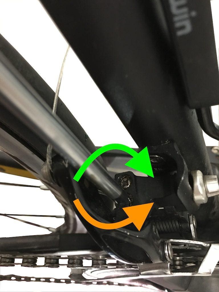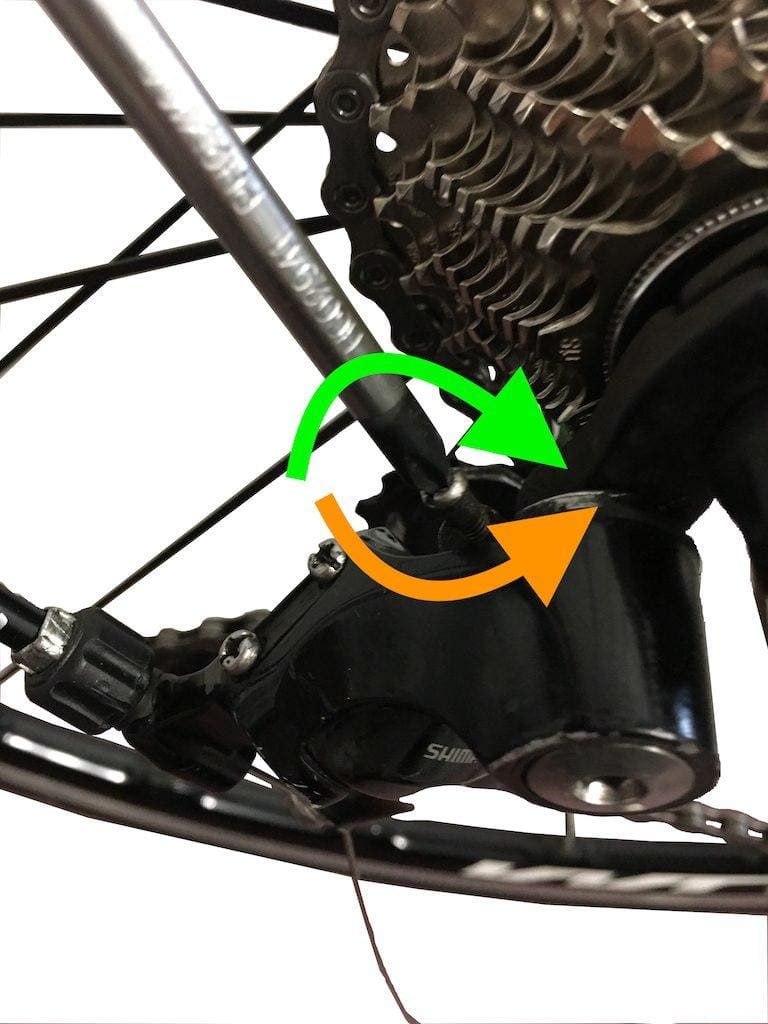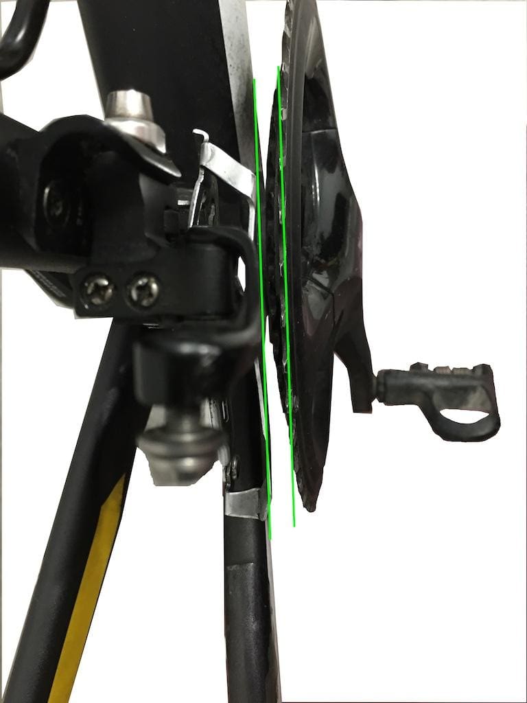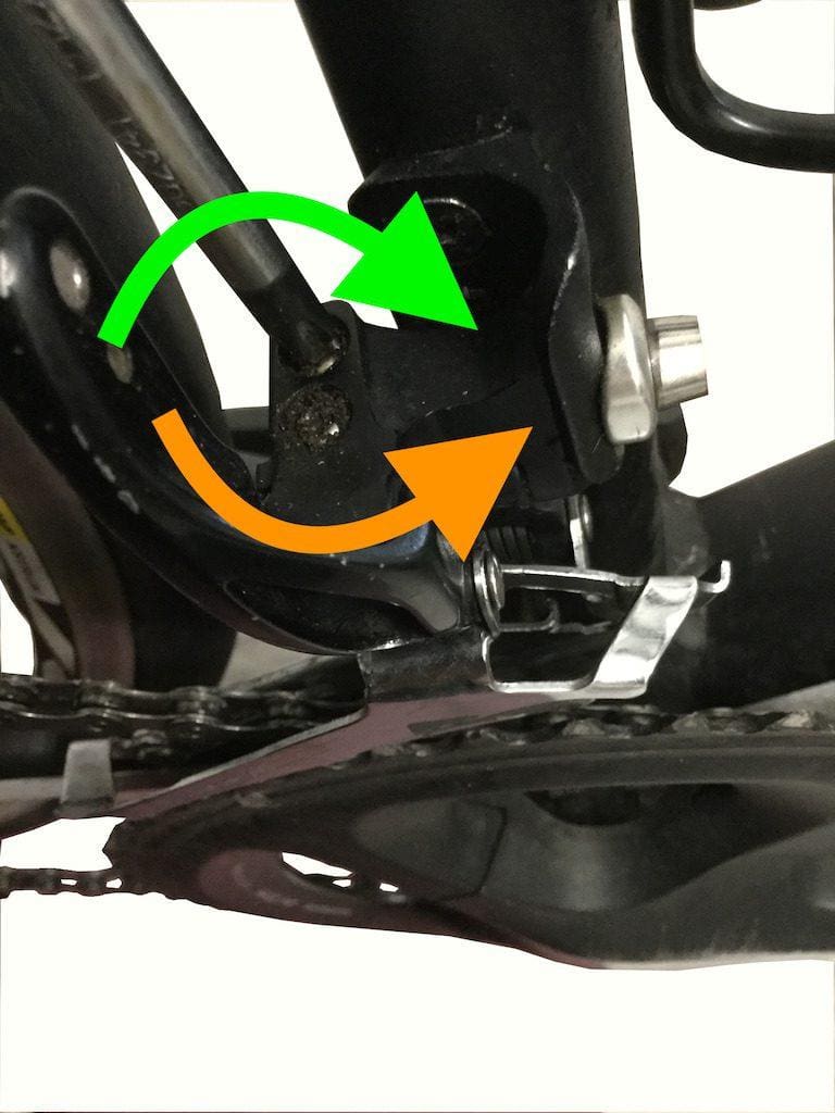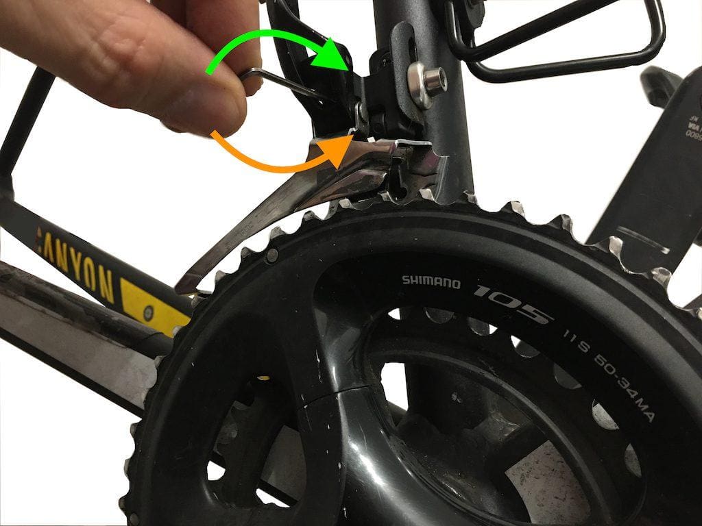 Maintenant on va orienter le dérailleur avant pour que sa face externe soit quasiment parallèle aux dents du grand plateau. L’extrémité postérieure du dérailleur peut être décalée de 0,5 à 1 mm vers l’intérieur.