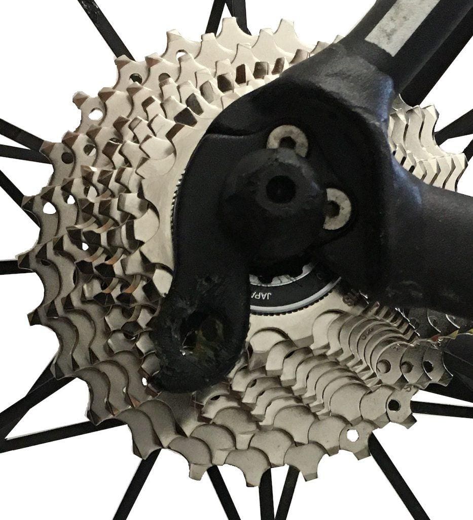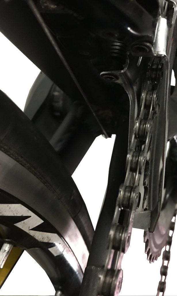 On commence par vérifier le serrage de la patte arrière. On contrôle visuellement qu’elle n’est pas tordue.