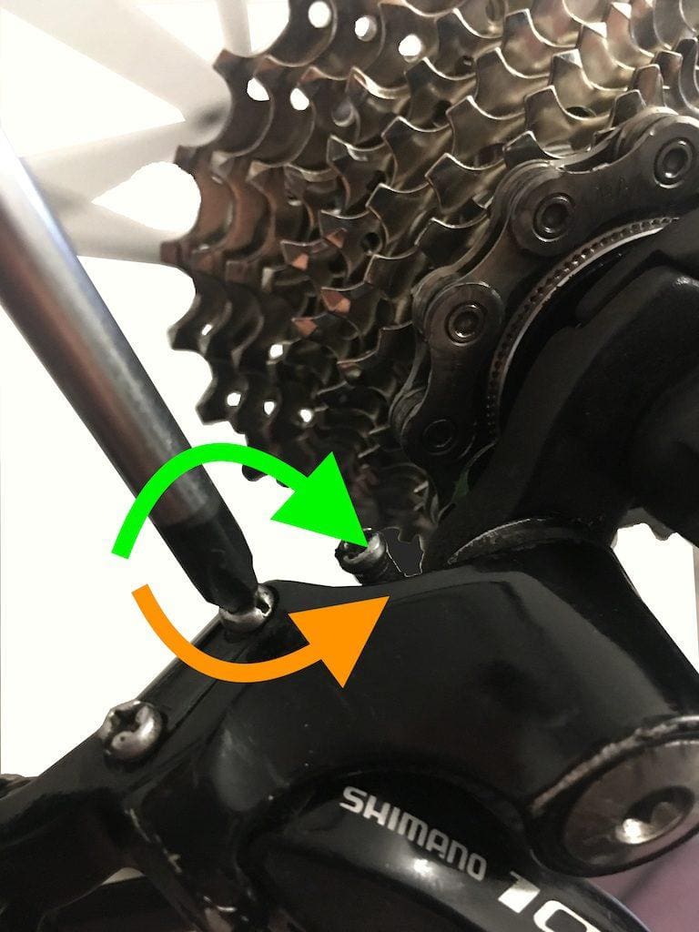 Il y a 3 vis sur l’arrière du dérailleur. La A est pour la course du petit pignon, la B pour la course du grand pignon et la C pour gérer l’écart entre les galets et les pignons.