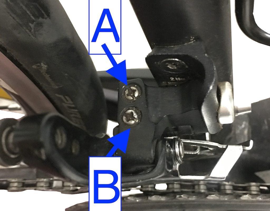 Sur le dérailleur avant, la vis A sert à la course du petit plateau, la vis B à la course du grand plateau.