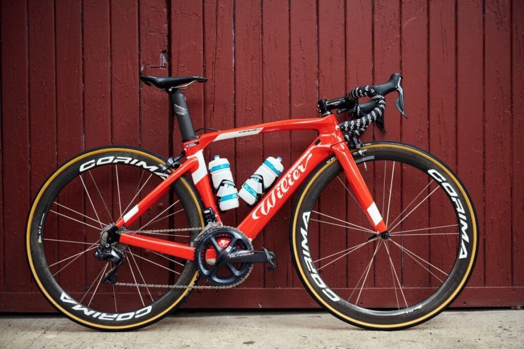 Au niveau de la transmission, l’équipe a choisi le groupe Shimano Ultegra Di2 avec des freins à patins. Les composants sont fiables et efficaces et juste un peu plus lourds que le Dura-Ace. Du côté des pédales, même politique, il s’agit de Look Keo 2 Max. En revanche en termes de roues et de boyaux, on fait les choses en grand. Les roues sont des Corima WS 47, identiques à celle du team masculin de l’année passée, et les boyaux sont des Veloflex Criterium, rien que cela ! Pour les périphériques, hormis la selle Prologo, dont le modèle varie d’une athlète à l’autre, on est dans du « Wilier ». La tige de selle est une Ritchey badgée Wilier et le guidon est produit par FSA. On retrouve des compteurs Garmin et des porte-bidons et bidons Elite.