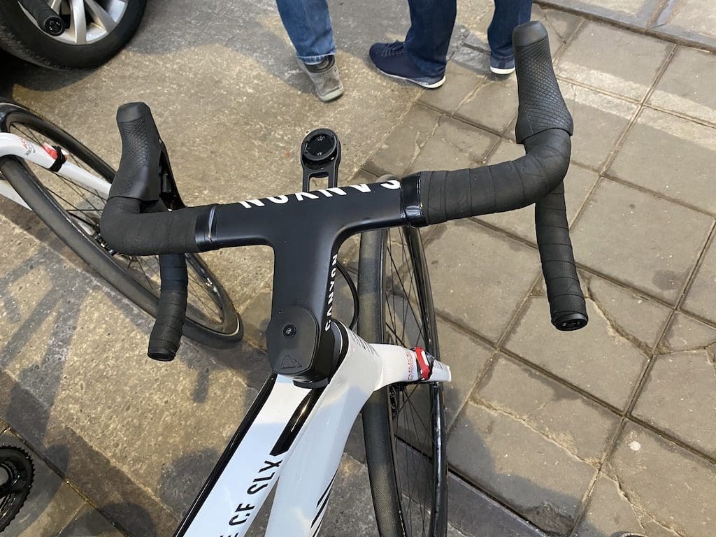 Les coureurs d’Arkea-Samsic ont pris le départ du Omloop Het Nieuwsblad 2020 sur des Canyon Ultimate CF SLX ou des Aeroad CF SLX. Ces machines, quasi-identiques dans leurs lignes et leur montage à celles des Alpecin-Fenix, diffèrent par la petite touche colorée sur le dessus du cadre. Les bretons sont en noir, les belges en bleu marine. Autre différence, moins visible, l’équipe française est aux normes UCI pour les freins à disque, à savoir 160/140 mm pour les rotors, là où les belges sont en 140 mm devant et derrière.