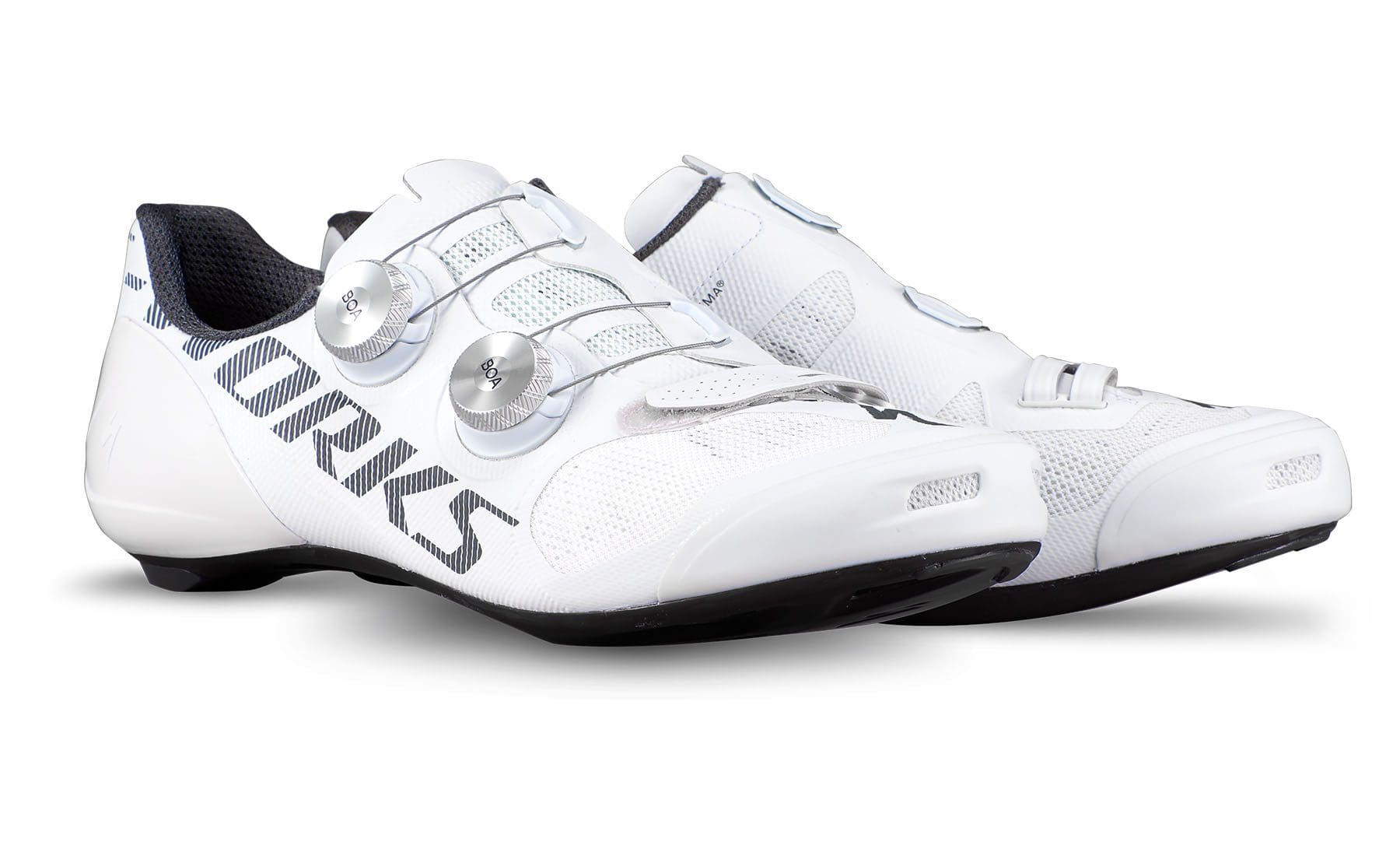 Le maître mot a été de réaliser une chaussure performante et confortable pour un usage professionnel et de disposer de la meilleure ventilation possible. Les Specialized S-Works 7 Vent disposent ainsi de la semelle Fact Powerline de la gamme Exos qui ne pèse que 66 g. Celle-ci comporte de nombreuses aérations recouvertes de mesh. La tige fait toujours appel à un mesh Dyneema renforcé par endroit d’inserts en TPU. Il y a des prises d’air pratiquées au bout du pied. Le pied est maintenu par 2 Boa S3-Snap et un velcro tandis que le talon est parfaitement calé par la coque Padlock qui l’englobe. Bien évidemment ces chaussures adoptent le concept Body Geometry, on retrouve donc le soutien longitudinal de voûte plantaire, le calage Varus et le bouton métatarsien. Le poids est limité, 446 g la paire en 42, et elles valent 400 €…