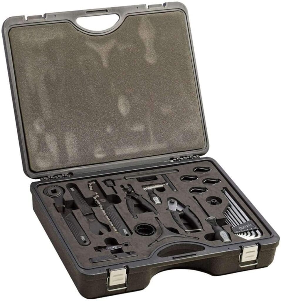 La mallette en plastique comporte 27 outils, étudiés pour les composants Shimano. Mais pas de panique, cela marche aussi pour Sram… Pour Campagnolo, cela sera moins vrai car il faudra prévoir un démonte-cassette et un dérive-chaîne compatibles. Pour le reste, tout conviendra… Les jeux de clé Torx (T20/25/30) et Allen (2/2,5/3/4/5/6/8/10) couvrent tous les besoins. L’outil pour les plateaux est spécifique Shimano, le dérive-chaîne conviendra aux chaînes en 11 vitesses. L’outil pour maillon rapide sera utile pour toutes les chaînes qui en sont équipées. La clé à pédale de 15 mm est assez spécifique mais elle rendra service ! La pince coupe-câble, les clés à rayons, les démonte-pneus et le tournevis cruciforme sont universels. Pour 227 € vous avez donc un kit complet. A notre avis, il sera bon de le compléter avec une clé dynamométrique, un produit incontournable désormais. Et pour les plus férus en mécanique équipés de freins à disque, il faudra compléter les outils d’un kit de purge Shimano ou autres car Pro n’en propose pas. Mais il faudra alors envisager une autre mallette car ici tous les outils ont déjà leur logement !