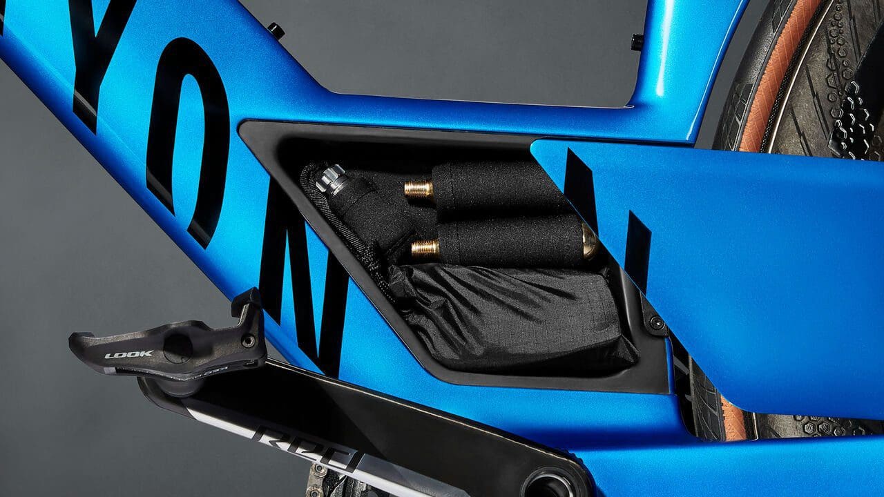 Mais comme le public visé est celui des triathlètes aucune importance. À 45 km/h, le Speedmax CFR fait gagner 9 watts par rapport l’ancienne version et surtout le cadre pèse 200 g de moins (1 480 g). Pour faciliter le ravitaillement, le Speedmax CFR intègre une poche de 750 ml de liquide avec un système d’hydratation qui permet de boire sans les mains ! Sur le tube supérieur, il y a une Bento box qui peut contenir des aliments. Au-dessus de la boîte de pédalier, il y a une box qui reçoit cartouches de CO2, démonte-pneus et chambre à air… Le vélo peut aussi recevoir un bidon sur son tube diagonal et un autre sous la selle.!