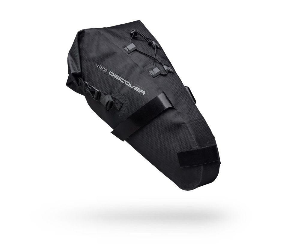 Afin de compléter son offre de bagages pour le gravel, Pro présente la ligne Discover Team, des sacoches étanches grâce à leurs coutures soudées. Elles sont également étudiées pour éviter le ballant. Il y a trois modèles dans cette collection. Nous avons d’abord une sacoche de selle qui contient jusqu’à 10 L, pèse 201 g et coûte 150 €. Elle dispose de fixations externes qui permettent de fixer des accessoires.