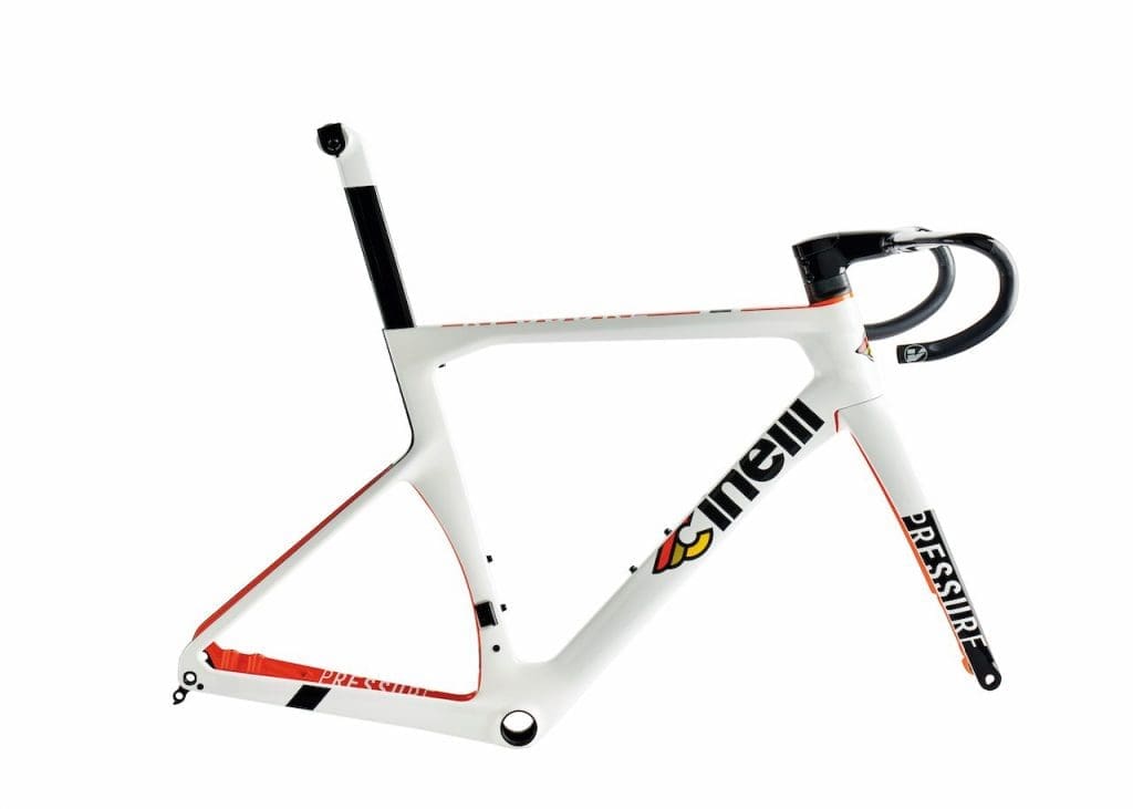 Le nouveau Cinelli Pressure utilise le système de direction FSA ACR qui permet une intégration totale des commandes de freins et de dérailleurs. Pour cela, il emploie un guidon intégral Vision Metron 5 D ACR qui permet une fluidité totale des lignes et des rotations. Le cadre est prévu pour recevoir des transmissions électroniques ou mécaniques, le moulage interne a permis d’avoir une structure « lisse » qui facilite le passage des gaines, durites et faisceaux. Le matériau de base employé est la fibre de carbon T800. Le Cinelli Pressure est décliné en 5 tailles, son triangle arrière est long de 410 mm de manière à optimiser la nervosité, tandis que la géométrie permet d’adopter une position aérodynamique. On peut également monter des pneus jusqu’à 30 mm. Il existe deux tailles de tige de selle. Au final, le cadre pèse 990 g et la fourche 390 g. L’ensemble cadre-fourche-tige de selle-guidon est vendu 3 500 €. Le vélo complet existe en quatre montages.