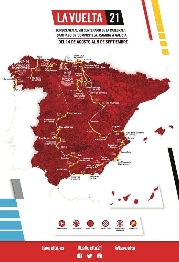 La Vuelta 2021 s’élance donc de Burgos le 14 août et sera peut-être l’occasion pour Primoz Roglic d’enchaîner trois succès d’affilée dans cette épreuve. Le champion olympique du contre-la-montre pourra sans conteste donner sa pleine mesure et effacer la déception du Tour 2021… Mais la tâche ne sera pas aisée pour autant car il y a du monde pour lui disputer le maillot Rouge, dont Egan Bernal ! La course sera à suivre sur Eurosport 1 et sur GCN, mais pas de diffusion « gratuite » cependant. Pour les box, il faudra avoir le bouquet optionnel qui permet de recevoir la télé espagnole. Sauf si vous avez un VPN pour faire croire que votre ordinateur est en Espagne afin des regarder TVE qui diffuse la Vuelta 2021… Les maillots de leaders sont fournis par Santini et à cette occasion la marque commercialise aussi des tenues en série limitée en hommage à diverses étapes.