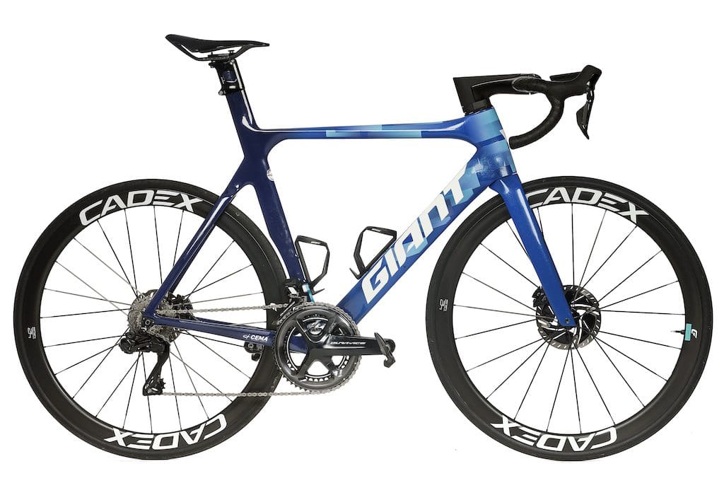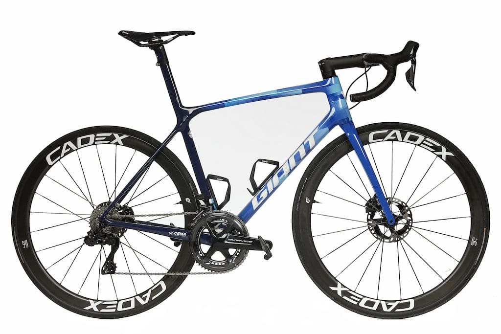 En 2022, les coureurs du Team BikeExchange-Jayco utiliseront des Giant TCR Advanced SL, des Propel Advanced SL et des Trinity Advanced Pro. Des machines que Michael Matthews connait bien en fait puisqu’en d’autres temps il a conquis le maillot vert du Tour de France sur la génération précédente de ces vélos. Pour le TCR, l’écart entre le vélo de pro et celui que le passionné peut s’acheter est vraiment infime. Puisque ces machines sont au catalogue telles quelles... Coloris mis à part. Côté composants, on retrouve des guidons, des selles, des porte-bidons et un GPS Giant. Les roues et pneumatiques viennent de la gamme Cadex, comme certaines selles d’ailleurs. La transmission, les pédales et le capteur de puissance sont en Shimano Dura-Ace Di2, 11 vitesses. Difficile de dire si c’est temporaire ou non à ce moment de la saison, les équipes sont aussi en attente de leur livraison… Les roulements sont remplacés par des roulements céramiques Cema.