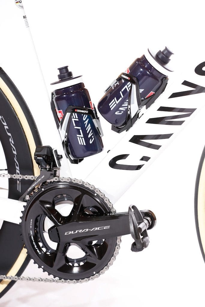 La plupart des vélos de l’équipe seront à ce coloris officiel. Mais les divers champions auront droit à leur version personnalisée en termes de décoration. On retrouve sur les Canyon Aeroad CFR le guidon monobloc de la marque qui complète l’intégration des commandes. Pour le montage en revanche tous auront le nouveau groupe Shimano Dura-Ace DI2 12 vitesses avec capteur de puissance. La marque japonaise fournit également les roues et les pédales. Et l’équipe reste sur boyaux Vittoria Corsa.