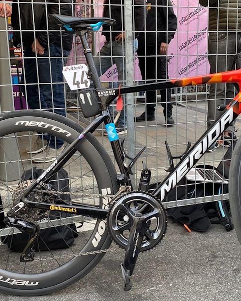 Le vélo utilisé par Matej Mohorič est identique au Merida Scultura de l’équipe Bahrain-Victorious, à un détail prêt : sa tige de selle. Pour Milan-San Remo 2022, le vélo de Mohorič était en effet équipé d’une tige de selle télescopique Fox Transfer SL. Un moyen de compenser la position « Mohorič » interdite désormais ? Certainement, le coureur est en recherche permanente pour améliorer ses performances en descente, là où l’aérodynamique joue un grand rôle. Cette tige de selle permet d’adopter une position haute et une basse avec une amplitude variant de 50 à 70 mm suivant le modèle.