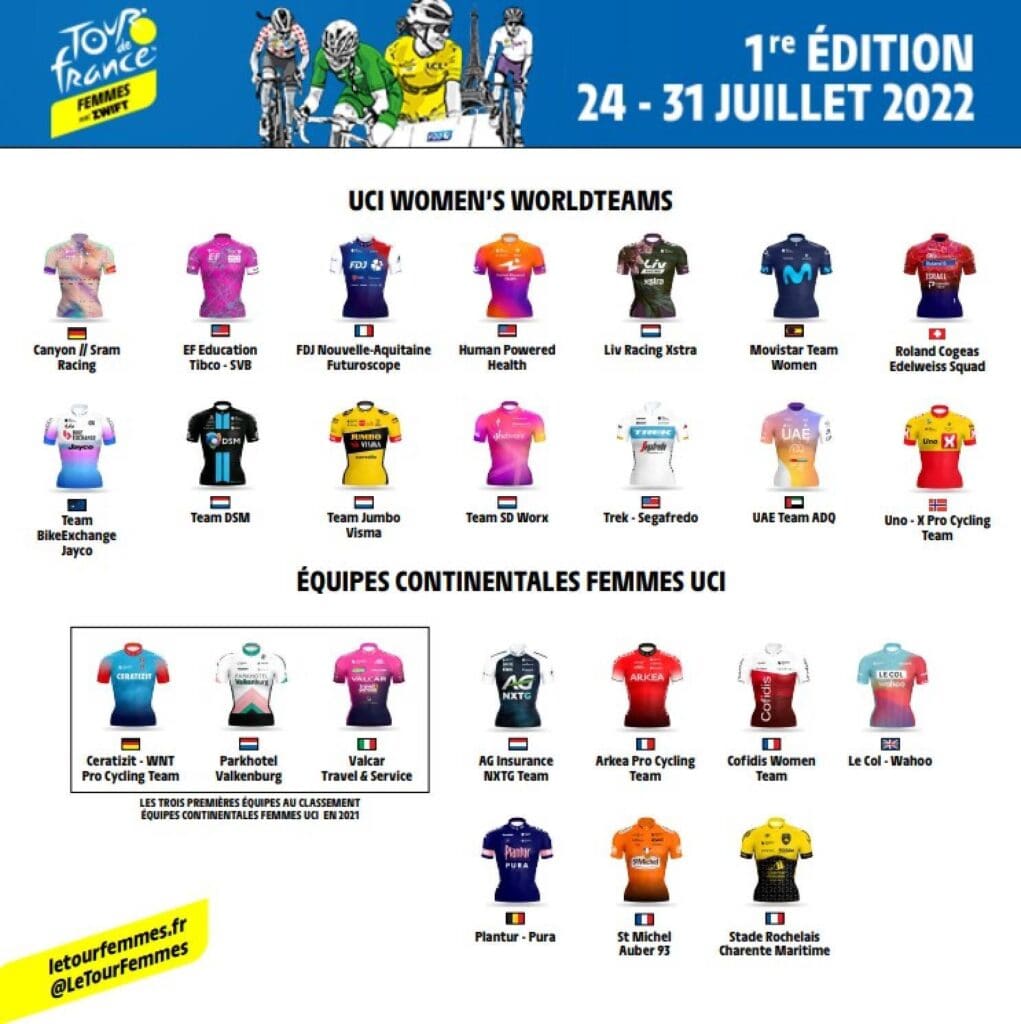 Il y aura 24 équipes au départ de Paris le 24 juillet 2022 et de quoi faire une course passionnante, puisque les top teams seront opposés à des formations moins cossues mais toutes aussi motivées. Le Tour a toujours fait de belles histoires, avis aux audacieuses ! Les équipes qui prendront part à ce premier Tour de France Femmes by Zwift sont désignées ainsi :