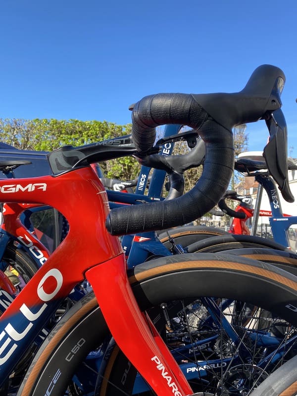 Ineos-Grenadier a fait le choix d’utiliser ses Pinarello Dogma F. Là encore à part la section des tubeless qui passe à 32 mm. On remarque que sur la seconde voiture d’assistance, les Pinarello était ceux de l’an passé avec freins à patins.