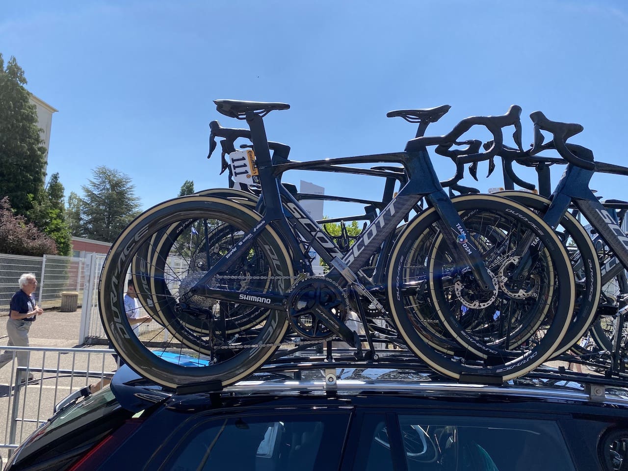 Un peu disparu des radars depuis quelques mois, le Scott Foil RC revient au premier plan. Mais dans sa nouvelle version sortie juste avant le Tour 2022 et exploitée par le Team DSM et son leader Romain Bardet. Il y a aussi pour la haute montagne des Scott Addict RC. L’équipe est en Shimano 12 vitesses et la plupart des coureurs ont le pédalier idoine. Il reste donc quelques modèles 11 vitesses. Pour les freins, l’équipe est en 160 mm/140 mm et roule exclusivement sur boyaux Vittoria Corsa.