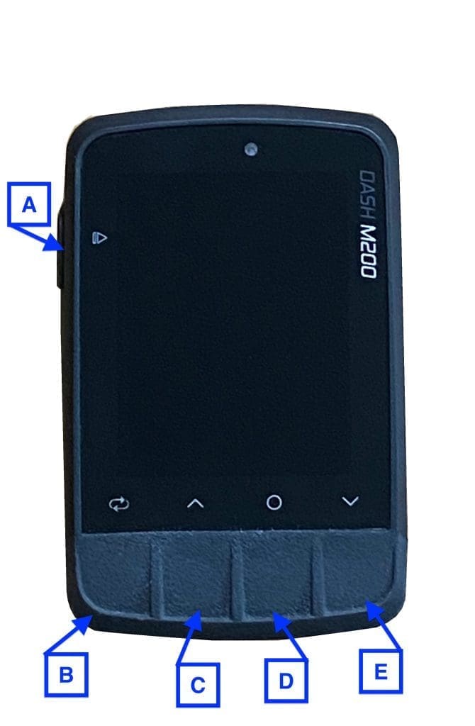 Le Stages Cycling Dash M200, comme le L200, se pilote avec 5 boutons. En mode portrait, le premier bouton (A) se situe latéralement en haut à gauche et sert à l’allumage et à l’extinction. Sur la face avant en bas et en partant de la gauche, le bouton (B) permet de revenir à l’écran d’avant et de faire des temps intermédiaires, le suivant (C) permet de « faire descendre » les fonctions et d’agrandir la carte, le (D) valide les choix et permet d’accéder au mode agrandissement. Le dernier le (E) de « faire monter » les fonctions et de réduire la carte. Point d’écran tactile mais cela se pilote quelles que soient les conditions météo et l’équipement (gants longs ou courts et doigts secs ou mouillés). La troisième touche permet d’avoir accès au mode agrandissement de la carte. On peut l’agrandir jusqu’à 17 fois. Pour l’extinction, on repasse sur le bouton latéral et une liste d’options s’affiche à l’écran, on choisit avec les autres boutons et on éteint en validant. Si le compteur est en mode paysage, les boutons sont placés sur le côté droit et face au cintre pour celui d’extinction. Une gymnastique à acquérir et qui réclame de l’attention.
