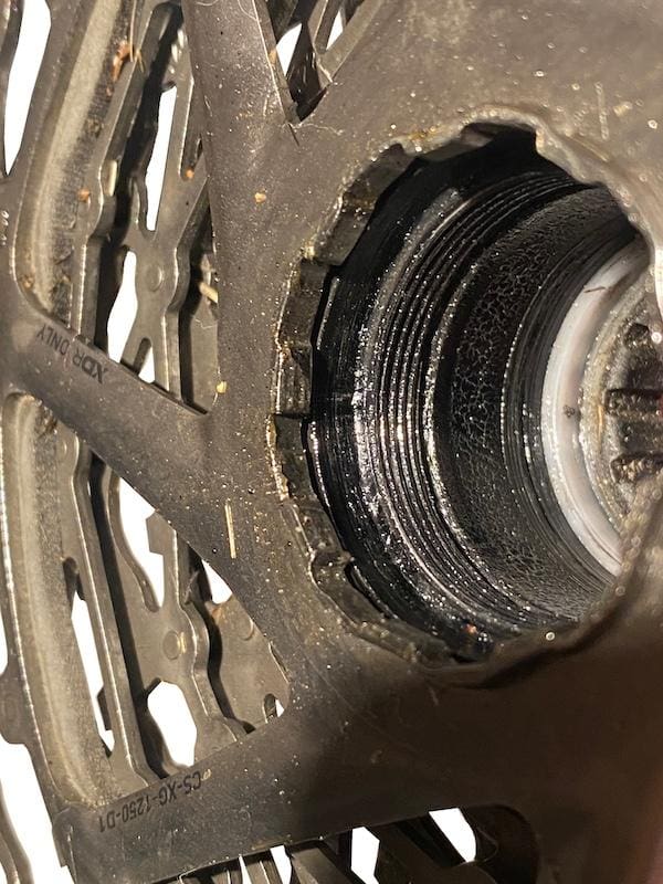 On voit bien les cannelures et le filetage qui font que la cassette XDR est un peu en porte à faux par rapport à une cassette traditionnelle.