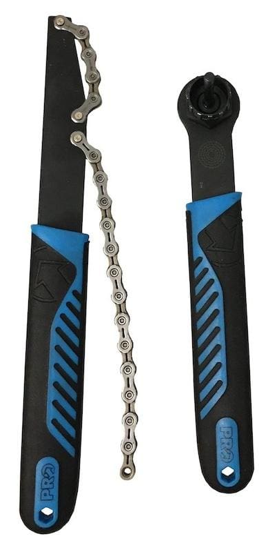 On va placer le fouet à chaîne sur le plus grand pignon ou l’avant dernier. On place ensuite le démonte cassette dans la boussole de la cassette. Et on appuie vers le bas sur les deux outils en même temps. Quand on sent que la cassette est débloquée, on maintient toujours le fouet et on dévisse la boussole jusqu’à ce que la cassette bouge.