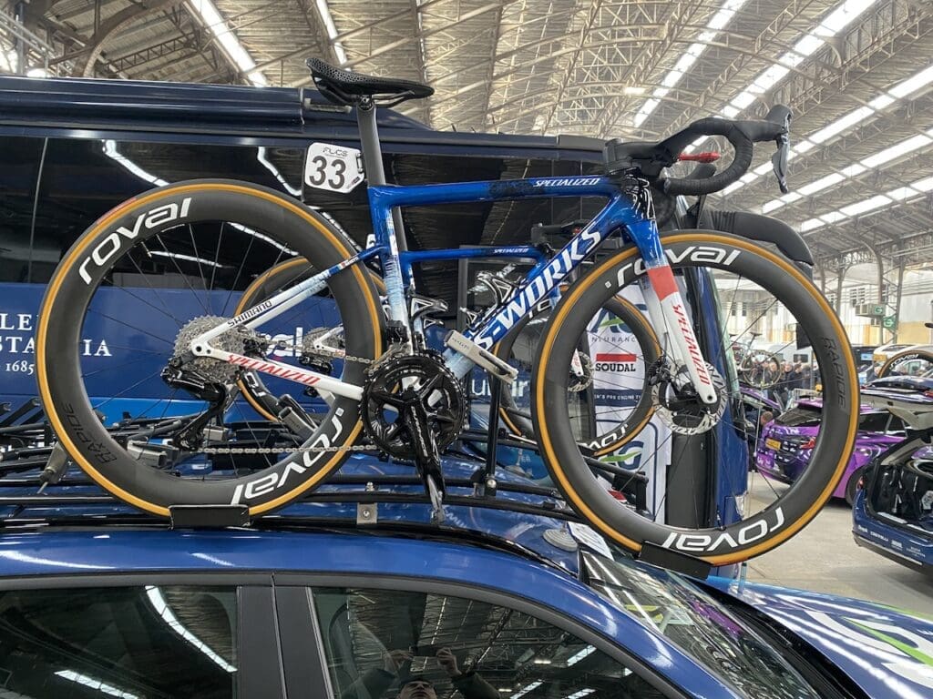 Pour la saison présente, les Specialized S-Works de la formation belge changent de déco. Les Tarmac SL8 de Soudal-Quick Step et d’AG Insurance-Soudal sont bleu marine et blanc désormais, avec un équipement quasi-identique à celui de 2024.