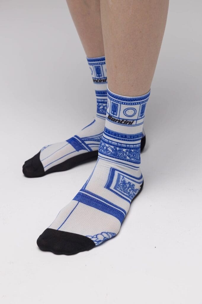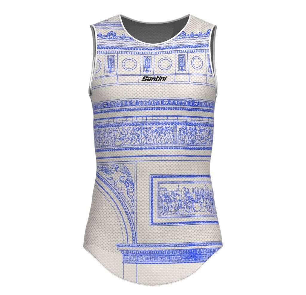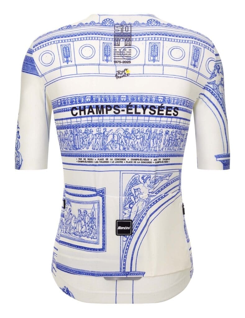 L’année 1975 est marquée par deux évènements majeurs pour le Tour de France. Bernard Thévenet met un terme à l’ère Eddy Merckx en remportant sa première Grande Boucle, mais cette année est aussi celle de la 1ère arrivée du Tour sur les Champs-Élysées. Santini propose le maillot Dash pour célébrer la victoire de Bernard Thévenet et la tenue Arc de Triomphe pour les Champs-Élysées. Les maillots sont en tissus Polartec Power Stretch (UV UPF 30+) avec une coupe ajustée, des manches à bord franc, une bande élastique à la taille et une fermeture zippée intégrale. Le cuissard Arc-de-Triomphe est en microfibre assurant une compression ciblée, les coutures réduites limitent les frictions. Le fond chamois GITevo offre absorption des chocs et confort durable.