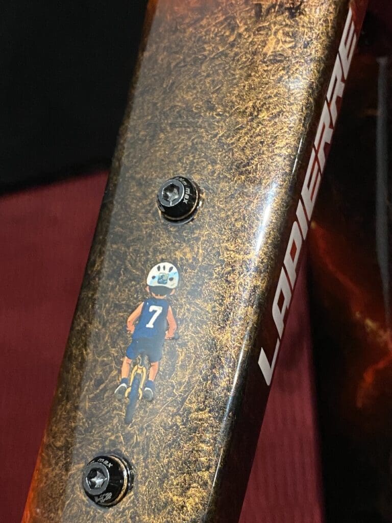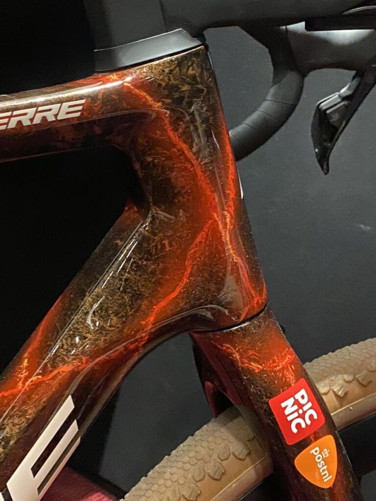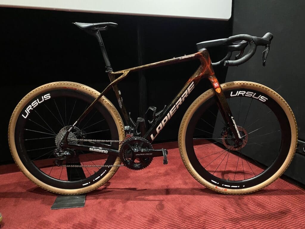 Pour ces compétitions gravel, Romain Bardet reste sur vélo Lapierre. Il roule sur un Crosshill CF que nous avons aperçu avant les championnat du monde 2025 de la discipline.
