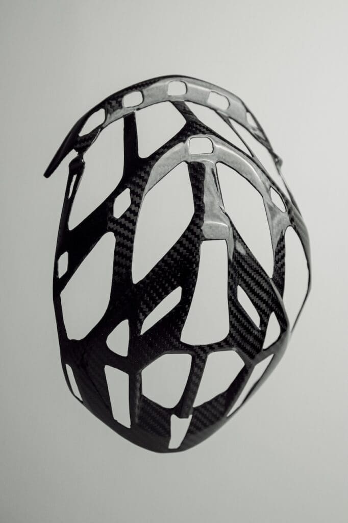 La chose la plus perceptible sur la nouvelle version du Met Trenta 3K Carbon c’est sa ventilation. Les résultats mesurés affichent un débit d’air augmenté de 16 %. Pour cela, il utilise l‘Airframe 3K : une structure d’aile en carbone supprime l’EPS à l’intérieur du casque pour créer de larges canaux « en plein »remplis » d’air. Le flux se déplace ainsi facilement et rapidement des entrées d’air, devant, aux extracteurs, derrière. Et cela fonctionne dès 12 km/h !
