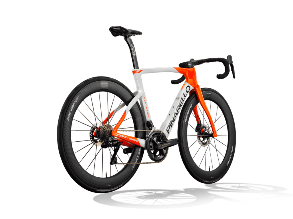 En 2026, les Ineos-Grenadiers vont chevaucher des Pinarello Dogma F orange et blanc en adéquation avec leur nouveau kit. L’équipe utilisera aussi les Bolide F TT, tous auront une transmission Shimano Dura-Ace, pédales et capteur de puissance compris. Most fournira les guidons, Prologo les selles, Garmin les GPS et Elite les porte-bidons. On retrouvera également sur les Pinarello 2026 d’Ineos Grenadier les tubeless Continental, mais la grosse nouveauté c’est l’arrivée des roues néerlandaises Scope Artech.